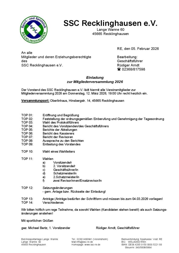 Am Donnerstag, 12. März 2026 findet um 19:00 Uhr unsere diesjährige Mitgliederversammlung im Oberlinhaus, Hinsbergstr. 14, Recklinghausen statt! Der Vorstand freut sich über zahlreiches Erscheinen der Mitglieder! Die Einladung und geplante und notwendige Satzungsänderungen findet ihr hier: